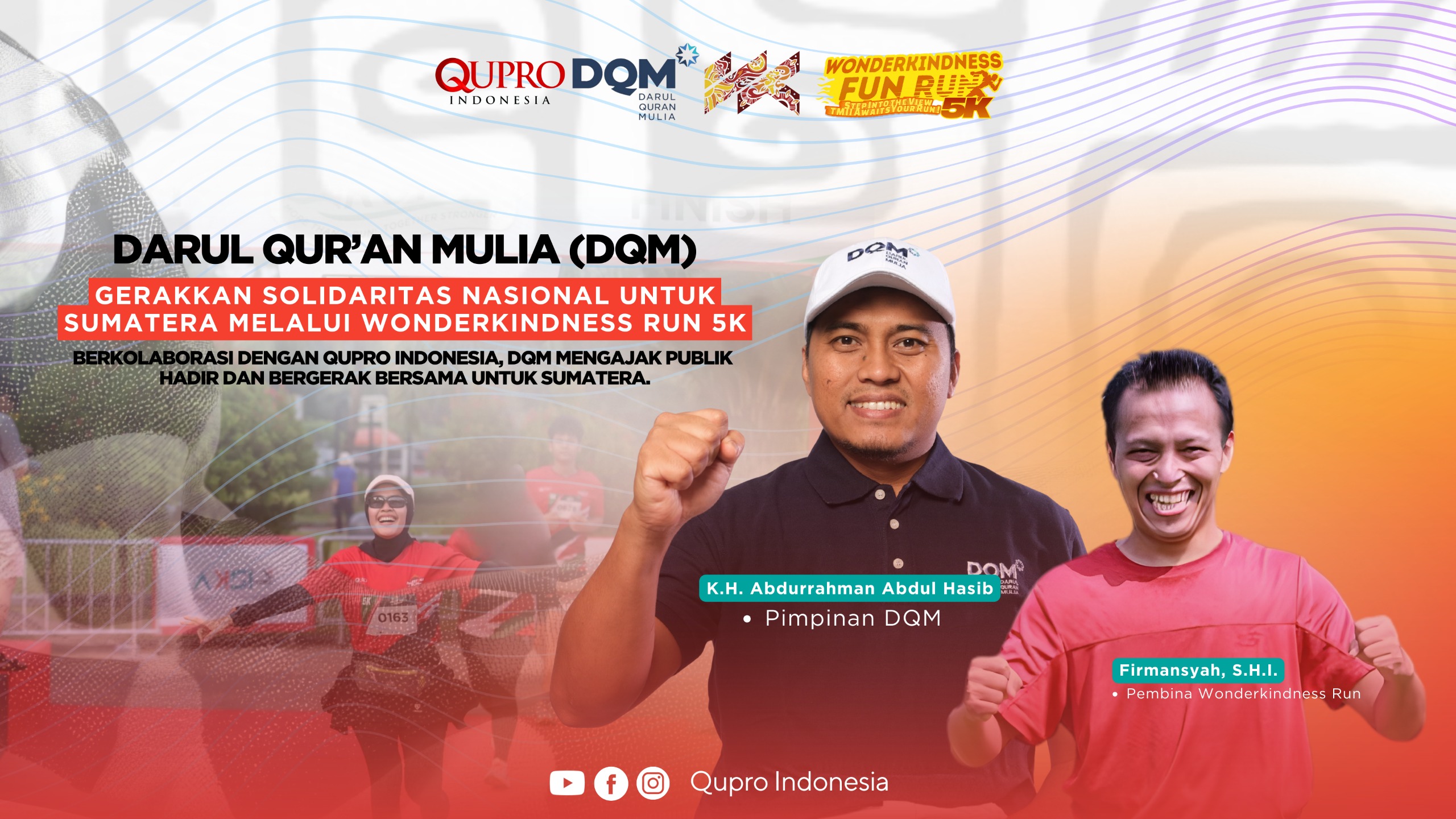 Darul Qur’an Mulia (DQM) kembali menegaskan identitasnya sebagai institusi pendidikan yang berdiri di garis terdepan dalam kepedulian sosial melalui aksi nyata. Dalam siaran pers DQM pada Jum’at 12 Desember 2025, DQM bersama QUPRO Indonesia menguatkan pesan bahwa pelaksanaan Wonderkindness Run 5K sebagai gerakan solidaritas, dan menyerukan partisipasi luas untuk mendukung warga Sumatera yang terdampak banjir bandang dan longsor.