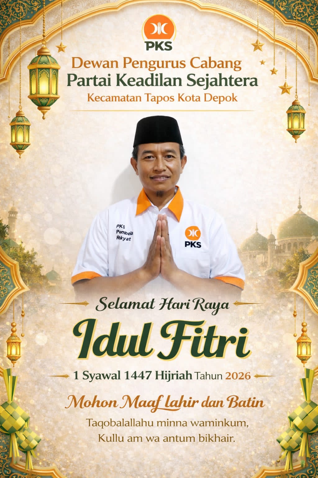 “Dalam kesempatan yang baik ini, kami atas nama pribadi dan struktur Dewan Pengurus Cabang Partai Keadilan Sejahtera Kecamatan Tapos mengucapkan Selamat Hari Raya Idul Fitri 1 Syawal 1447 Hijriah Tahun 2026. Mohon maaf lahir dan batin. Taqobalallah minna waminkum, kullu amin wa antum bikhoir,” tuturnya. (shl)
