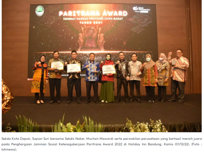 DepokNews–Pemerintah Kota (Pemkot) Depok meraih Penghargaan Jaminan Sosial Ketenagakerjaan Paritrana Award 2022 untuk kategori kabupaten/kota. Piagam penghargaan tersebut diserahkan oleh Sekretaris Daerah (Sekda) Provinsi Jawa Barat (Jabar), Setiawan Wangsaatmaja kepada Sekda Kota Depok, Supian Suri di Hotel Holiday Inn, Kota Bandung, Senin (01/12/22) siang.