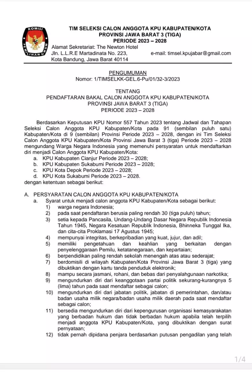 “Berkasnya diantar langsung atau melalui jasa ekspedisi ke alamat Sekretariat Tim Seleksi di The Newton Hotel, Jln. L.L.R.E Martadinata No. 223, Kota Bandung, Jawa Barat 40114 dengan narahubung 081286376657,” katanya.