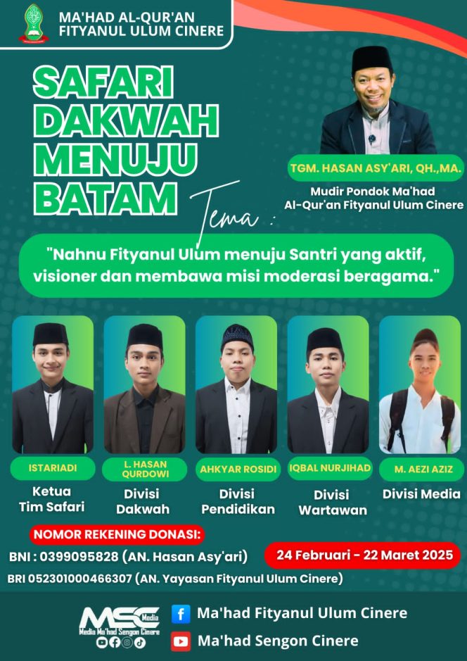 “Kegiatan ini merupakan bagian dari program dakwah Ma’had Al-Qur’an Fityanul Ulum Cinere untuk memperluas syiar Islam dan memberikan pengalaman dakwah langsung kepada para santri,” ujar TGM. Hasan Asy’ari, MA (Mudir Ma’had Al-Qur’an Fityanul Ulum Cinere).