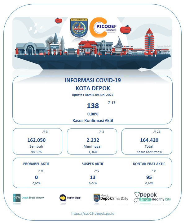 DepokNews – Pemerintah Kota (Pemkot) Depok kembali memperbarui data perkembangan kasus Covid-19 di Kota Depok. Berdasarkan data yang dirilis per tanggal 09 Juni 2022, terjadi penurunan yang signifikan pada kasus konfirmasi positif.
