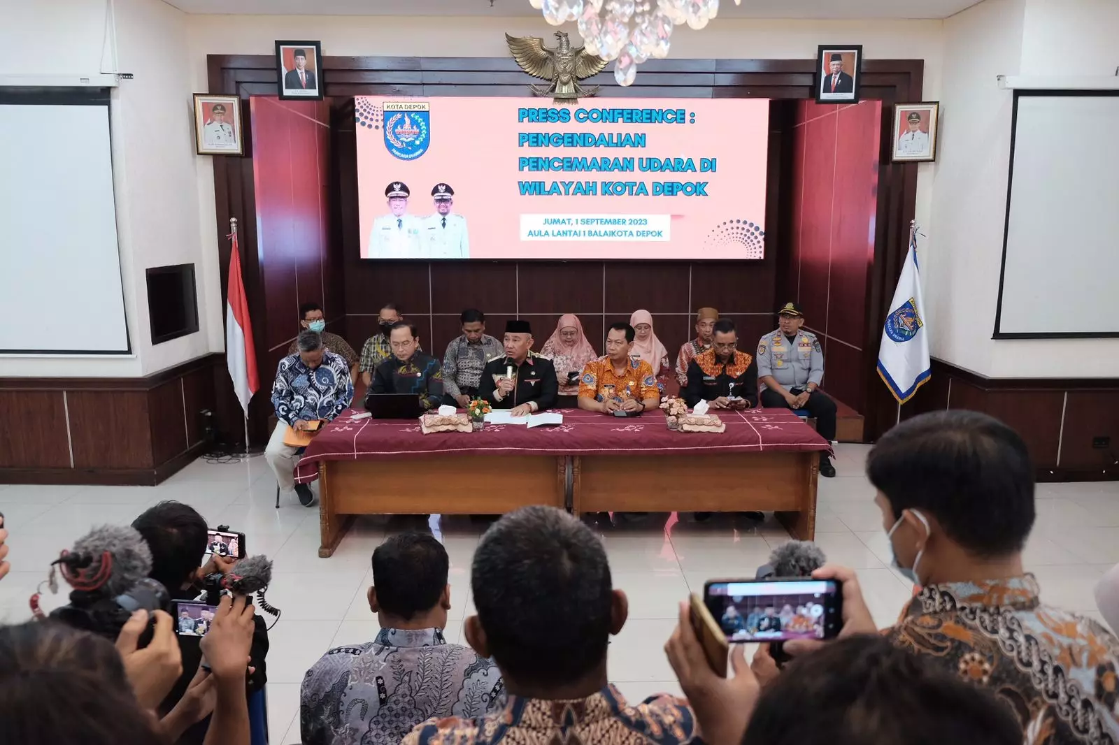 Wali Kota Depok, Mohammad Idris bersama jajaran saat melakukan konferensi pers terkait pengendalian pencemaran udara di Aula Teratai, lantai 1, Balai Kota Depok, Jumat (01/09/23). (Foto: Diskominfo).