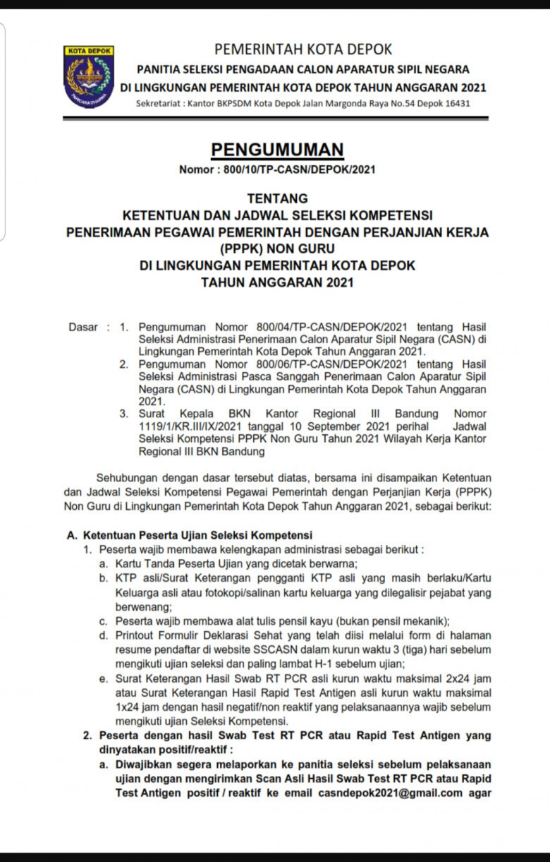 DepokNews – Pemerintah Kota (Pemkot) Depok melalui Panitia Seleksi Pengadaan Calon Aparatur Sipil Negara (CASN) resmi mengumumkan tentang ketentuan dan jadwal seleksi kompetensi penerimaan Pegawai Pemerintah Dengan Perjanjian Kerja (PPPK) Non Guru. Hal tersebut tertuang dalam Surat Pengumuman Nomor: 800/10/TP-CASN/Depok/2021, tentang Ketentuan dan Jadwal Seleksi Kompetensi untuk Pegawai Pemerintah dengan Perjanjian Kerja (PPPK) Non Guru, di lingkungan Pemerintah Kota (Pemkot) Depok Tahun Anggaran 2021.