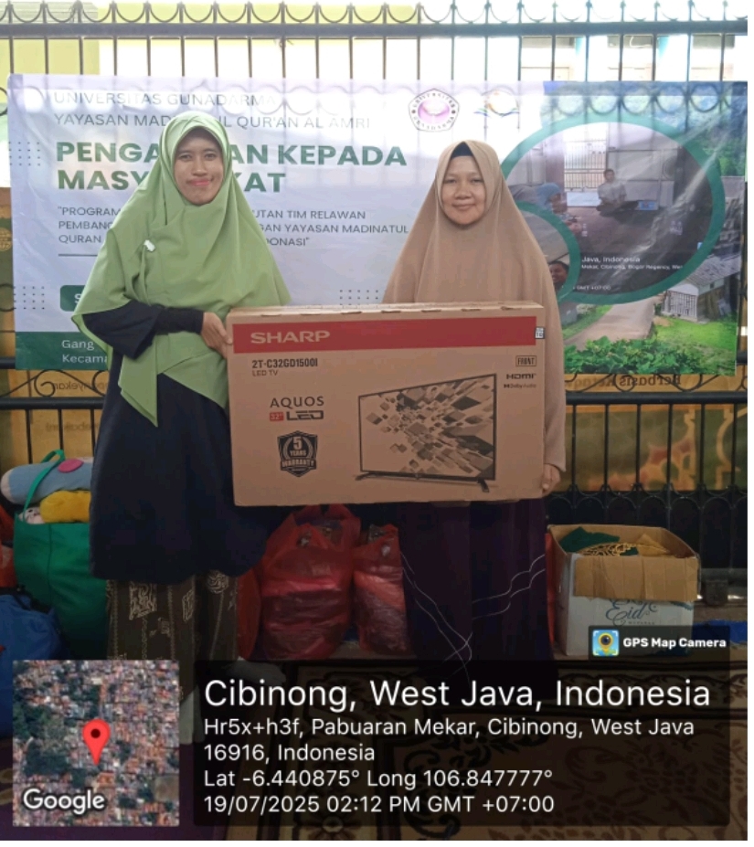 DepokNews–Universitas Gunadarma kembali menunjukkan komitmennya dalam pengabdian kepada masyarakat melalui kegiatan bertajuk Program Pendampingan Lanjutan Tim Relawan Pembangunan dan Pengembangan Yayasan Madinatul Quran Al Amri serta Pemberian Donasi Barang Berharga Layak Pakai. Kegiatan ini dilaksanakan pada Sabtu, 19 Juli 2025, di Yayasan Madinatul Quran Al Amri yang berlokasi di Pabuaran Mekar, Cibinong, Kabupaten Bogor.